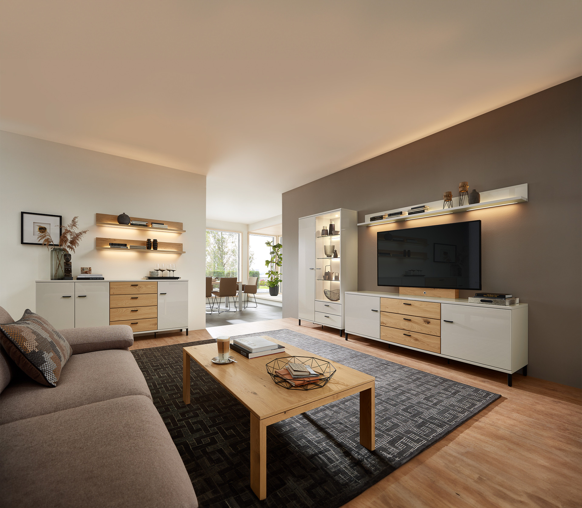 Vitrine, Lowboard und Wandboard fügen sich harmonisch zu einem eleganten TV-Bereich zusammen, während das offene Regalsystem mit integrierter Arbeitsplatzlösung zeigt, wie flexibel und ganzheitlich geplant werden kann – perfekt für modernes Wohnen mit Anspruch an Design und Alltagstauglichkeit.